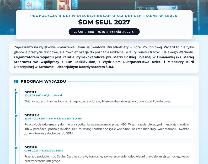 Rozpoczęły się w naszej diecezji zapisy na ŚDM w Seulu, które odbędą się na przełomie lipca i sierpnia przyszłego roku. Szczegółowe informacje na stronie: www.ruszdusze.diecezjatarnow.pl/sdm-seul-2027